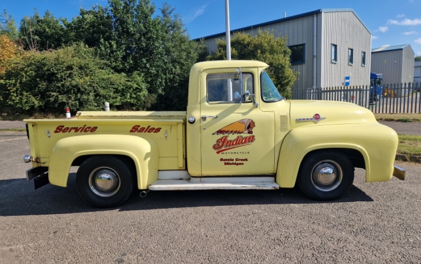 Body - 1956 Ford F100 Short Bed truck which Im told was a one year only option in 56. The body and chassis are solid. It has a bit Patina in bits. Wings were repainted a few years back. Indian motorcycle decals which really suit it. If you want a shiny show stopper then this is maybe not the one, but if you want something thats nice, well sorted and can use all the time without worrying too much then this certainly fits the bill.