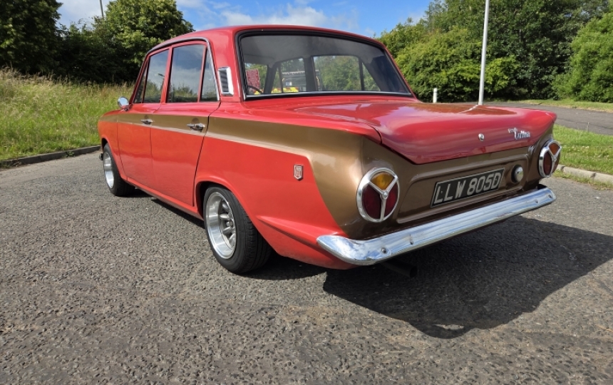 Body - MK1 Cortina GT shell with tramp bar brackets intact. The car is solid underneath currently and is painted body colour. There is evidence of repairs over the years in the usual places, which are visible. You can see exactly whats been done as its not hiding under gallons of underseal. Underbonnet area has recently been refreshed and is very tidy. Boot area is good and solid. Paintwork is showing its age a bit. Its perfectly useable but if you wanted a show car youd need to update the paintwork. Bubbling on the bottom of 3 of the doors and evidence of previous repairs in these areas as well as the bottoms of wings. Not uncommon for a near 60 year old car, by any means. Gold flash is a decal rather than painted. Good quarter bumpers, grille, mirrors.