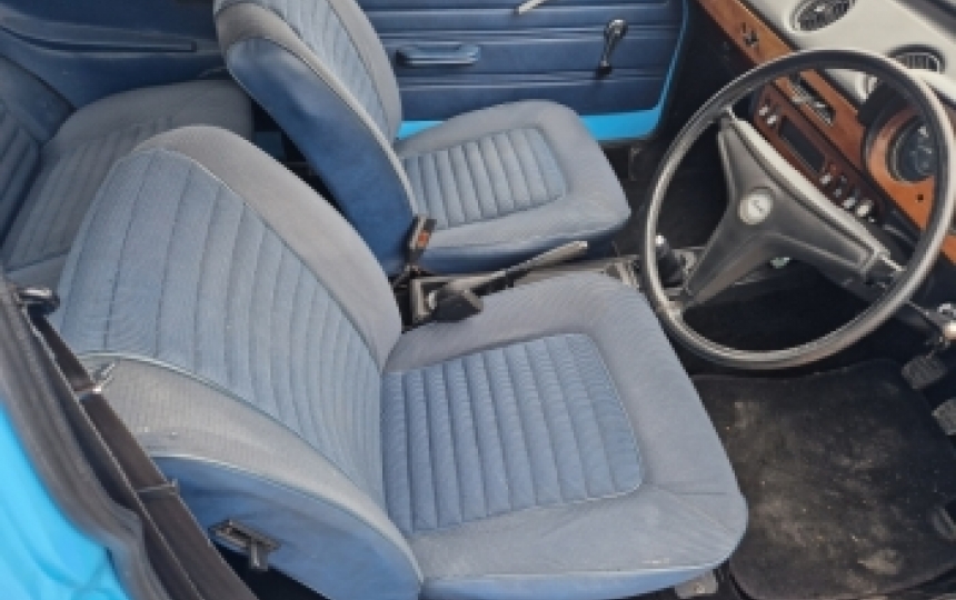 Interior - Super rare Blue 1300E interior and matching blue door cards. Correct 6 dial dash and wood finishings. Still has the ice scraper in centre console. Lovely original interior.