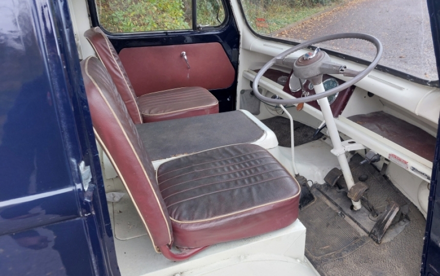 Body - Very Solid Old Van. Looks very original underneath and really solid. Panels are good. Originally the van was black / cream up top from new but is now a midnight blue colour. Paintwork is nice and tidy. Its not concours but very tidy and useable . Inside the cab and rear is painted white. It looks a very original old thing rather than something thats had major restoration work.